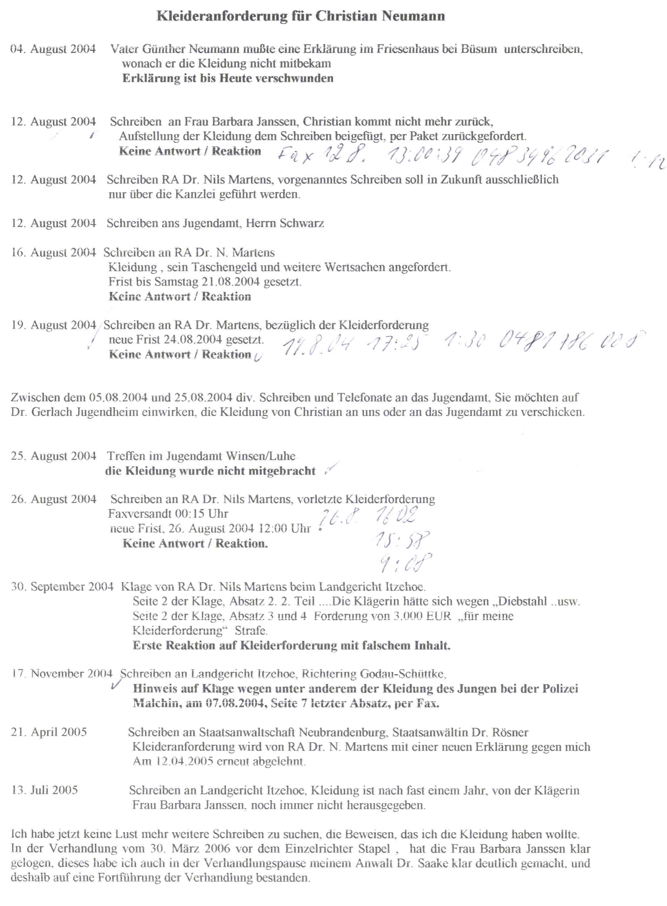 16. August 2004 Kleidung/ Taschengeld erstmals von Frau Barbara Janssen über RA Dr. Martens angefordert keine Reaktion 19.08.2004 erneutes Schreiben an RA Dr. Martens keine Reaktion Div. Schreiben an das Jugendamt Winsen/Luhe, sie das Jugendamt möchte auf die Jugendeinrichtung einwirken, die Kleidung/Geld herauszugeben. 25.08.2004 Treffen in den Räumen des Jugendamtes, die Kleidung/Taschengeld wird nicht mitgebracht, Zeugen Mutter/Vater des Jungen, Herr Schwarz (Leiter) und Frau Henke-Bökmann vom Jugendamt,Winsen/Luhe, und Herr Dr. Gerlach und zum ersten mal ist Frau Barbara Janssen vom Jugendheim Büsum anwesend. Danach verschwindet Herr Dr. Gerlach von der Bildfläche und wird nicht mehr gesehen, siehe Dr.Gerlach. Schreiben an RA Dr. Martens, Kleidung/ Geld nicht mitgebracht,mit Strafanzeige jetzt gedroht, keine Reaktion. 30.09.2004 Einreichung der Klage von RA Dr. Martens vor dem Landgericht wegen der Kleider/Geldforderung.